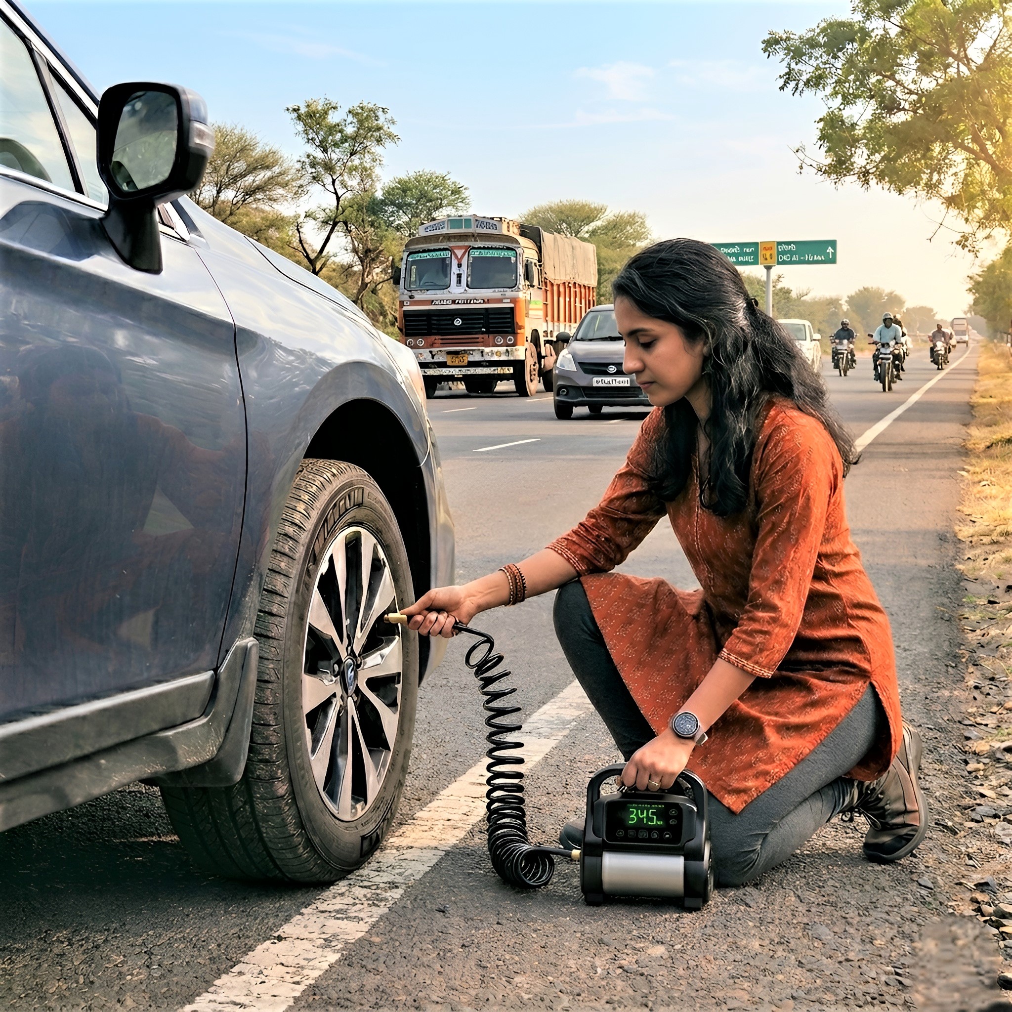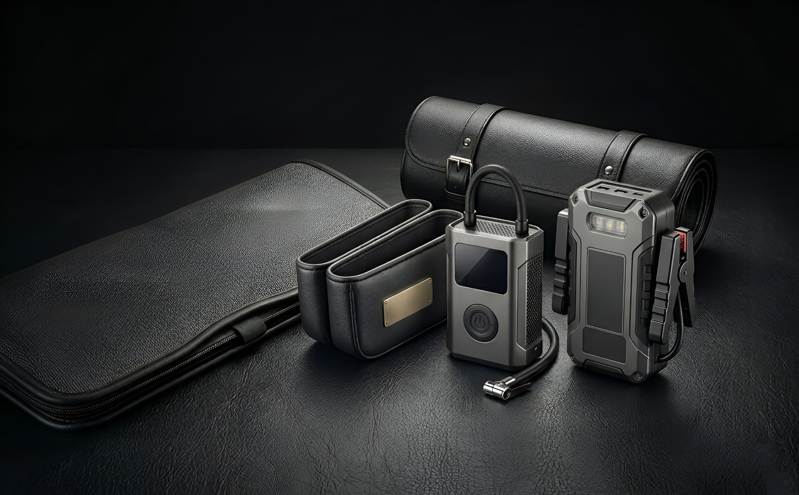 Critical road safety equipment including tyre inflators, smart jump starters, and multi-tools.